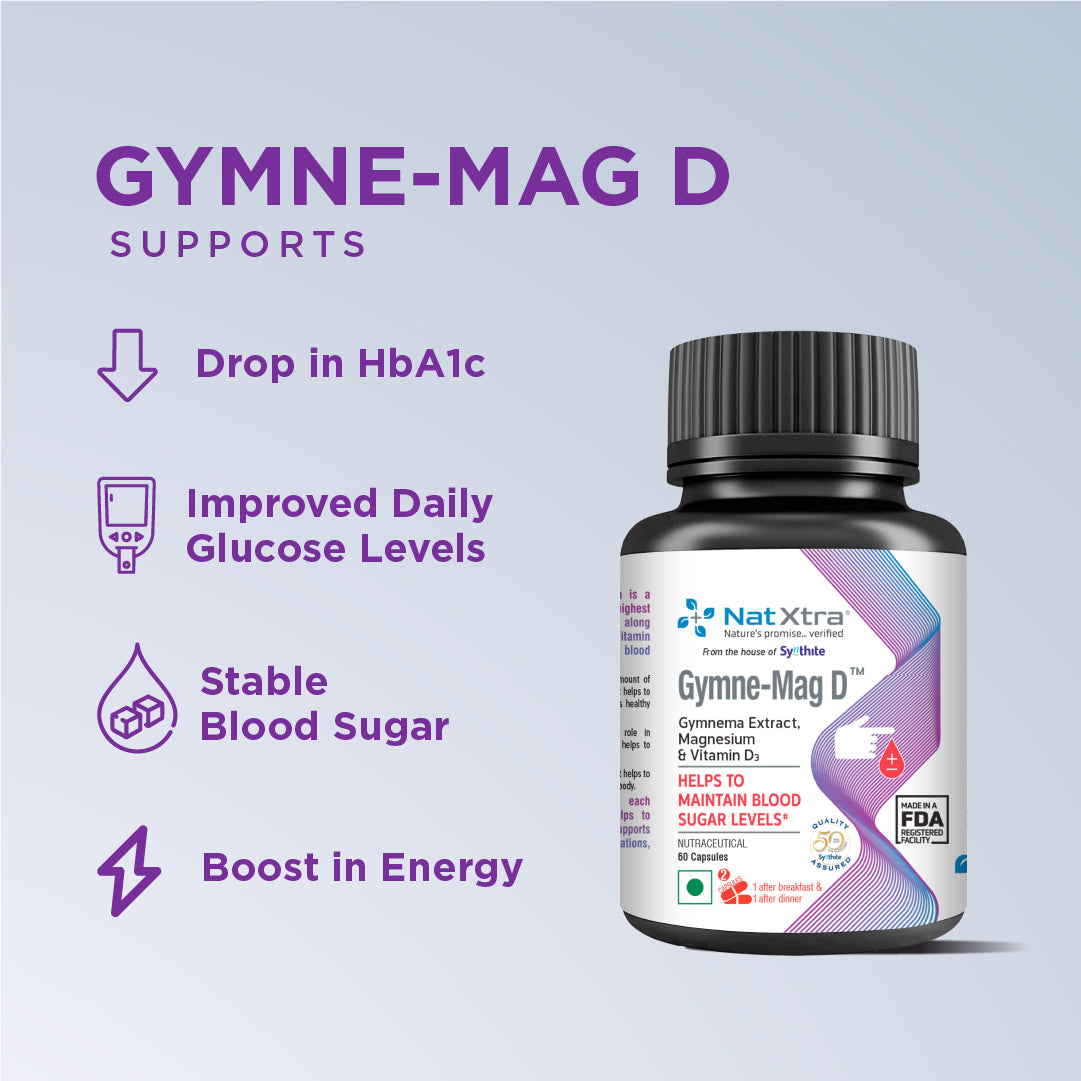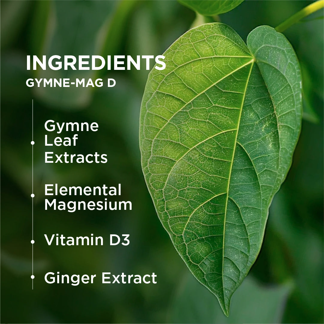 Each capsule of Gymnemag-D contains Gymnema leaf extract, Elemental Magnesium and Vitamin D3