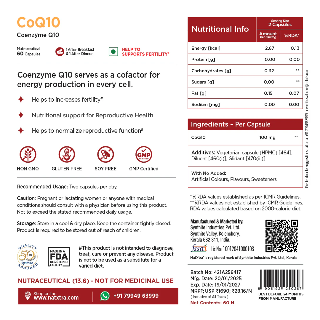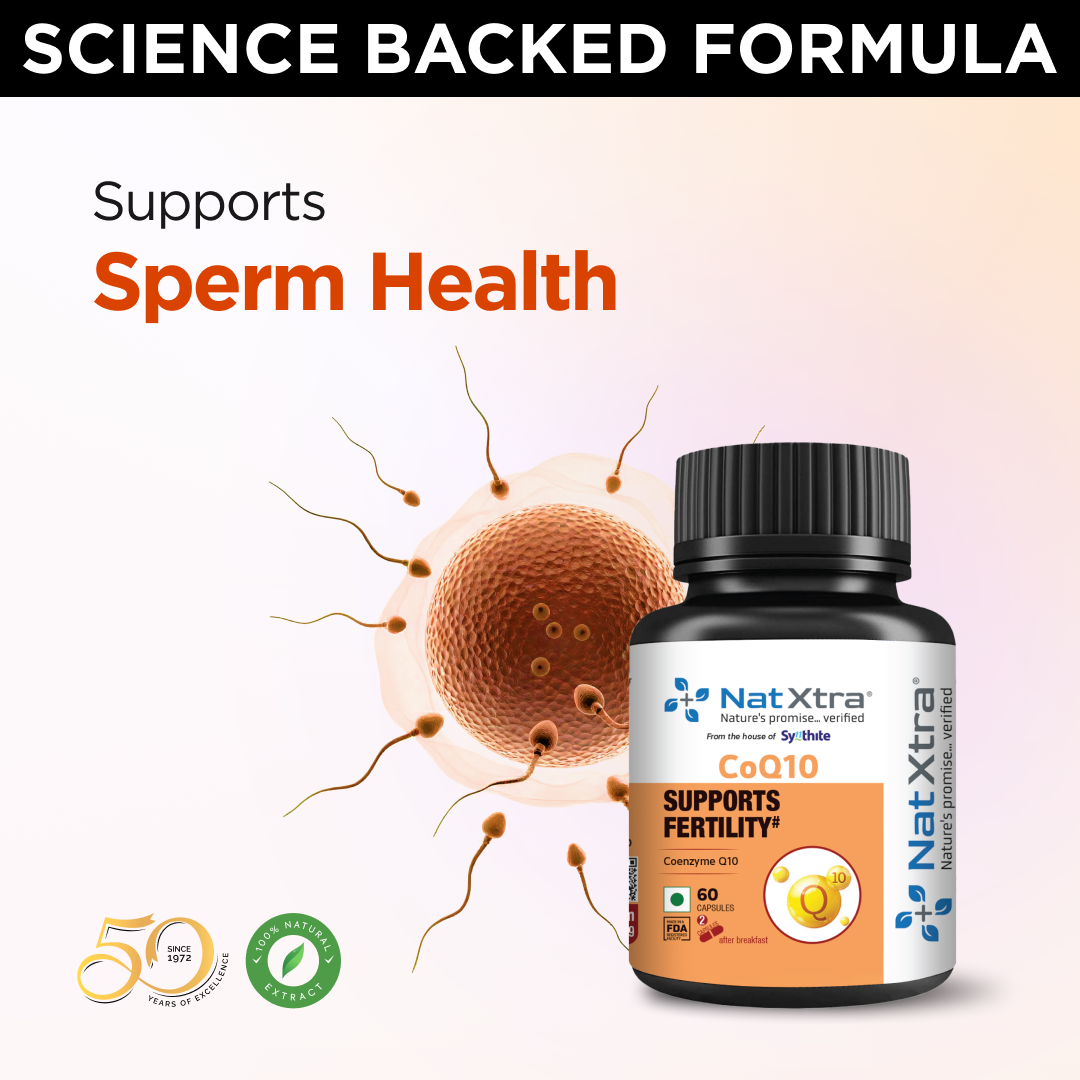 CoQ10 is a naturally occurring antioxidant that reduces oxidative stress and improves sperm health. CoQ10 enhances sperm functioning and contributes to overall male fertility. Natxtra CoQ10 is made with pure natural extracts, is scientifically tested and has zero side effects.