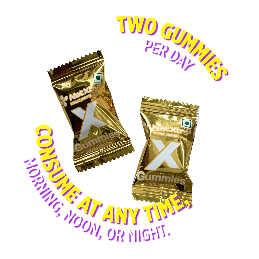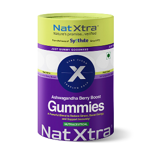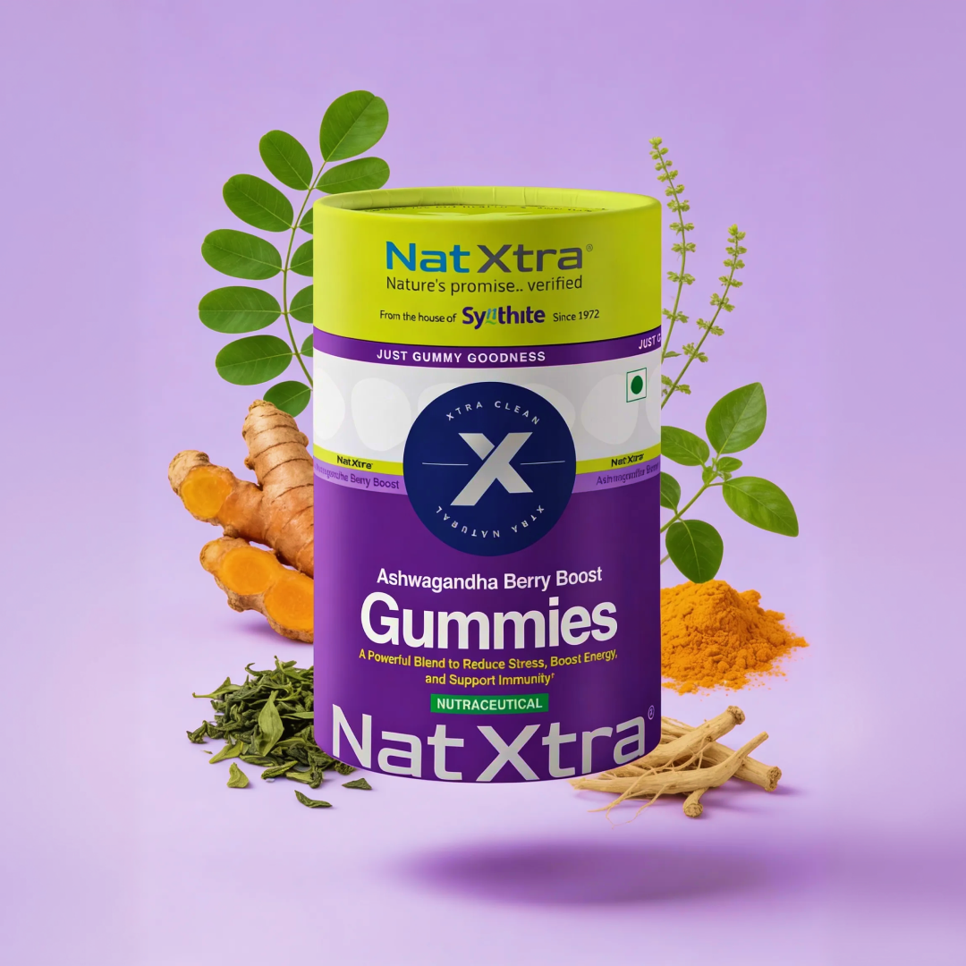 Each gummy of NatXtra Ashwagandha Berry Boost is enriched with the goodness of Ashwagandha extract, Turmeric extract (Curcumin), Moringa extract, Green Tea extract, and Coenzyme Q10 (CoQ10) — blended with natural soluble fiber for enhanced wellness, energy, and immunity support.