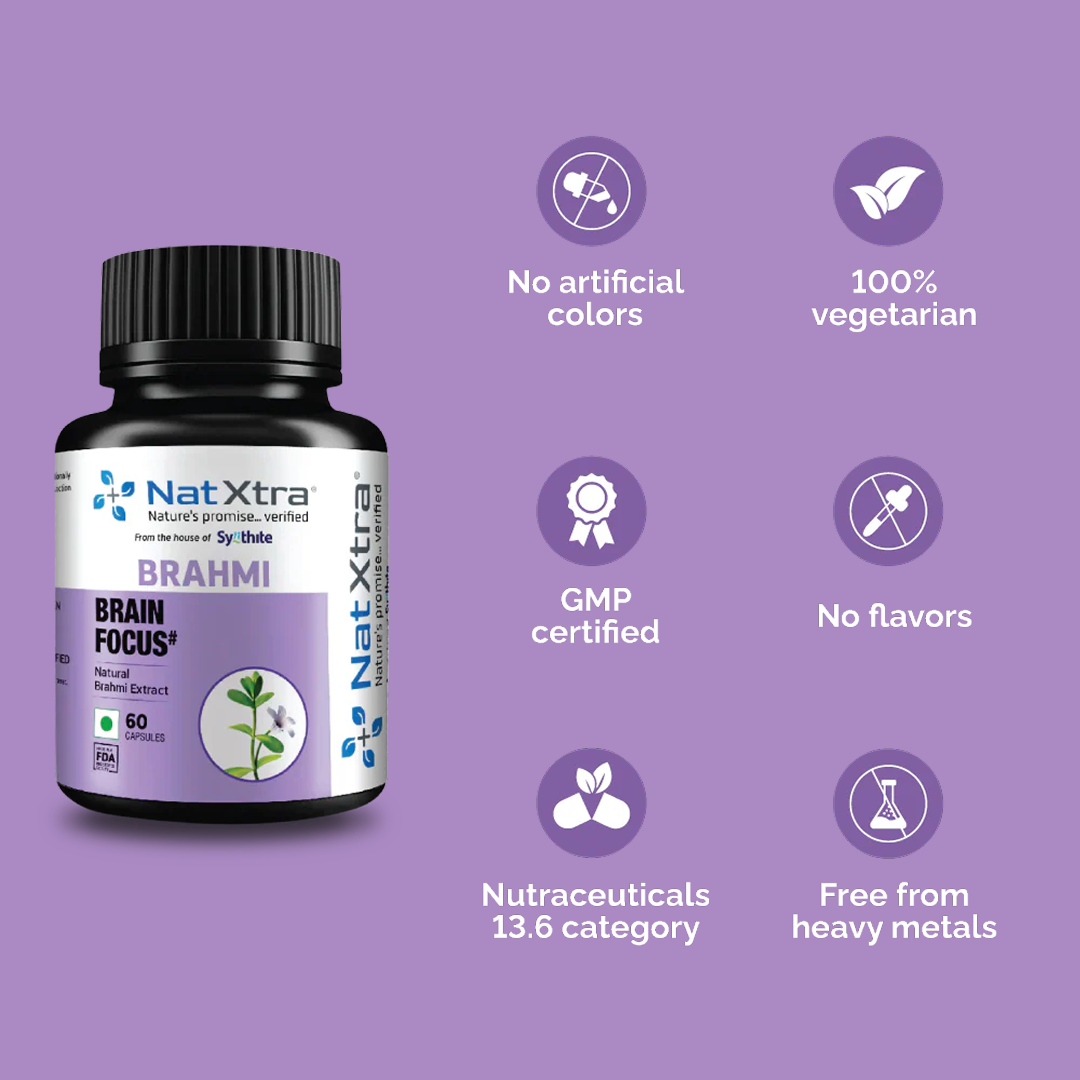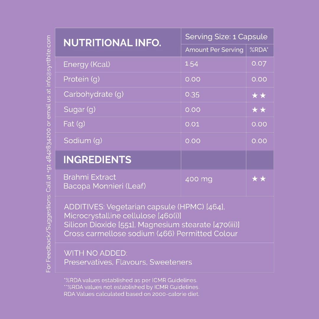 Each capsule of Brahmi is enriched with the goodness of all-natural Bacopa Monnieri extract.