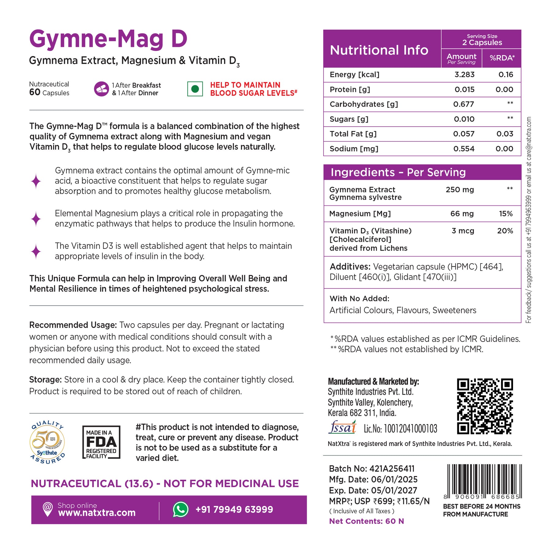 Each capsule of Gymne-Mag D is enriched with the goodness of all-natural Gymnema extract, Elemental magnesium and vegan vitamin D3