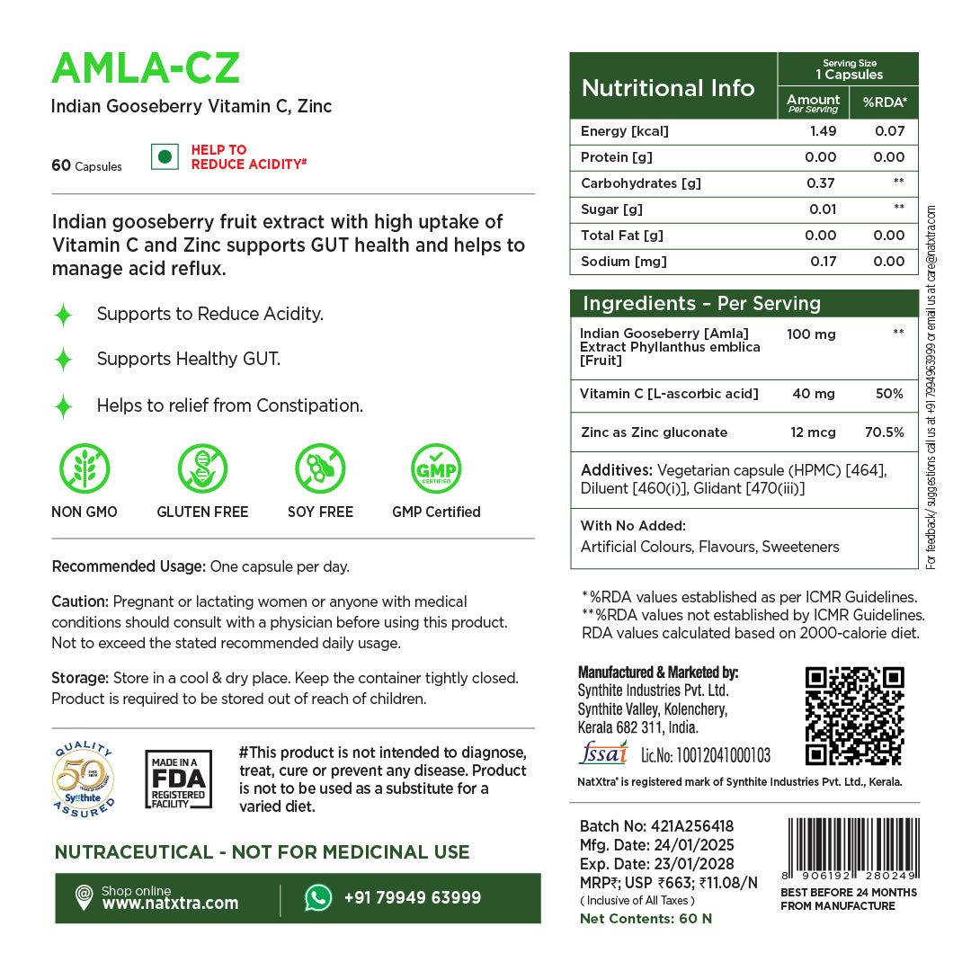 Amla-CZ formula combines natural Phyllanthus embilca fruit extract enriched with Vitamin C & Active Zinc. The duo complement each other to prevent acidity and bloating as well as promote healthy metabolism.