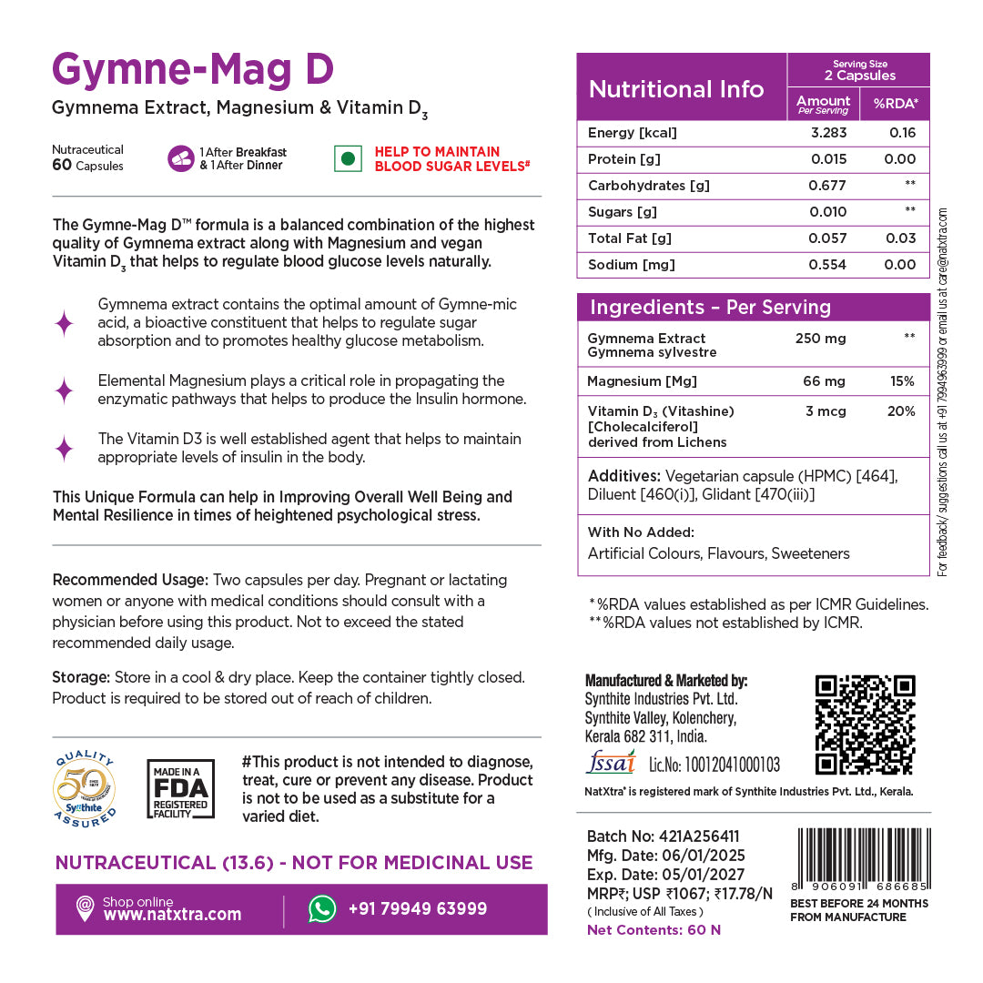 Each capsule of Gymne-Mag D is enriched with the goodness of all-natural Gymnema extract, Elemental magnesium and vegan vitamin D3 Each capsule of ProPlus contains Pumpkin seed oil, Quercetin, Vitamin D3 and Selenium.